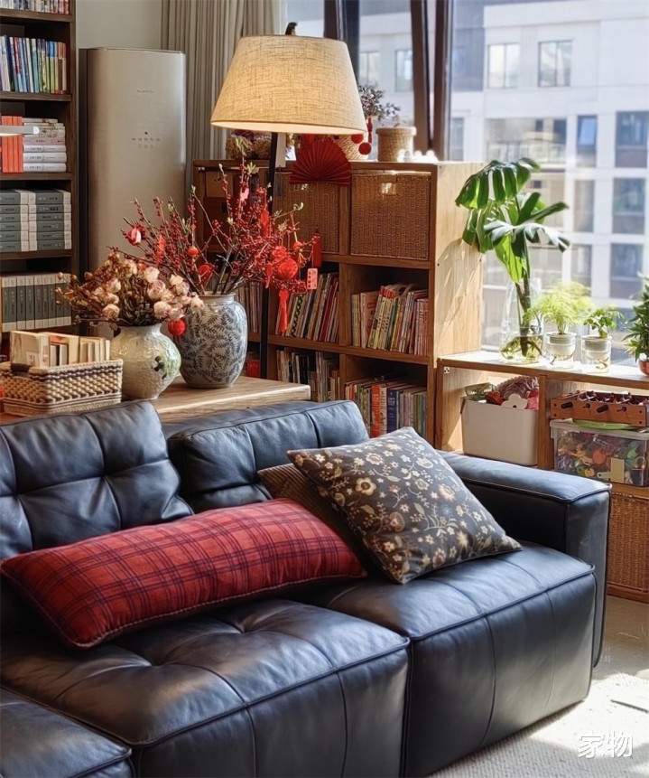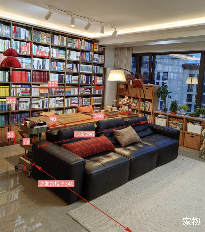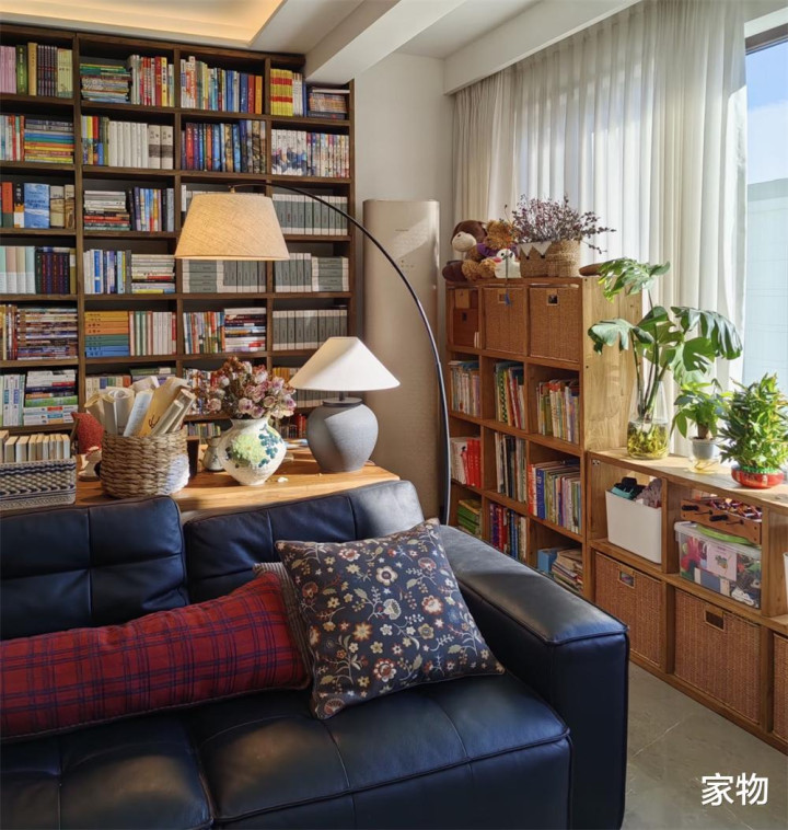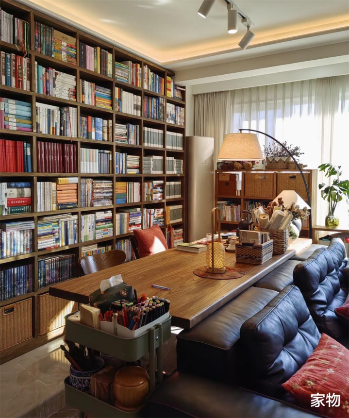 蓝本沙发靠墙的打发,当今平移上前,留出版桌和通顶式大书架的空间,书架上,一家三口的多样竹帛摆放得满满当当,它既是刚需收纳,又是客厅里最有糊口吻味的遮挡,实用性确切相等可以。