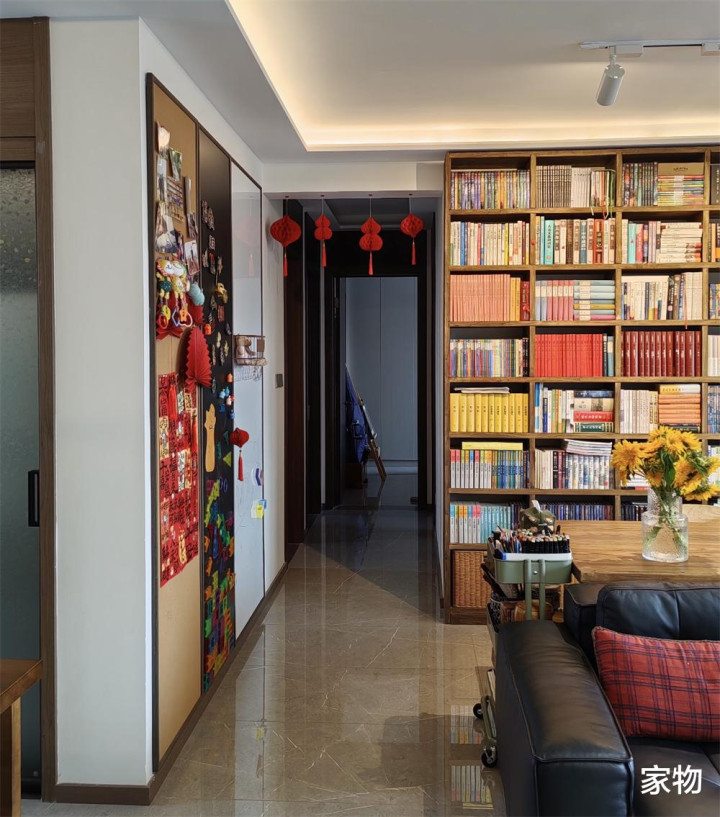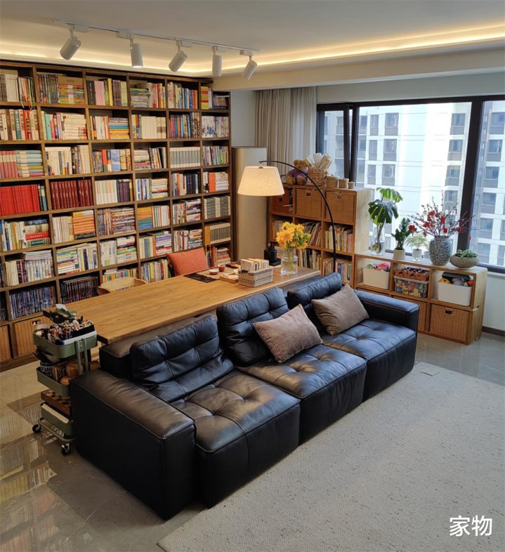 这家东谈主的客厅开间只消5米7,为了能作念出一个实用性较强的横厅,一家东谈主取消了茶几和电视墙,转而用书架、书桌、沙发+满墙电视柜代替,确切又好意思瞻念又实用。