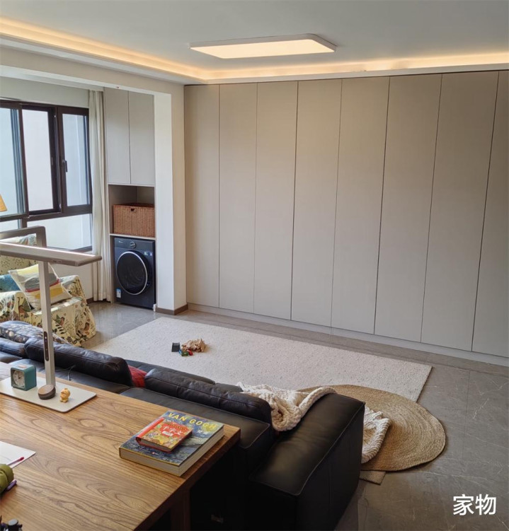 主要因为,沙发对面并不是咱们念念象中的电视墙,而是一整面墙的收纳柜,柜门平整,也可以算作念投影仪的幕布来使用,偶尔望望电视剧电影齐没问题。