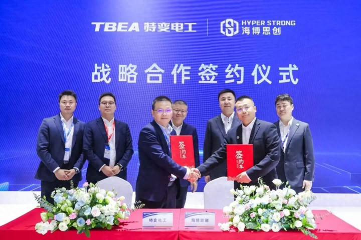 海博想创首创东说念主、董事长、首席实施官张剑辉,特变电工新动力党委通知、董事长黄汉杰,海博想创连合首创东说念主、首席技艺官钱昊,特变电工新动力策略市集部部长姚进展,特变电工新动力储能家具总司理赵亮亮共同出席签约典礼。海博想创国内销售总司理温之兴、特变电工新动力储能业务总司理刘召迎诀别代表两边签署策略配合条约。