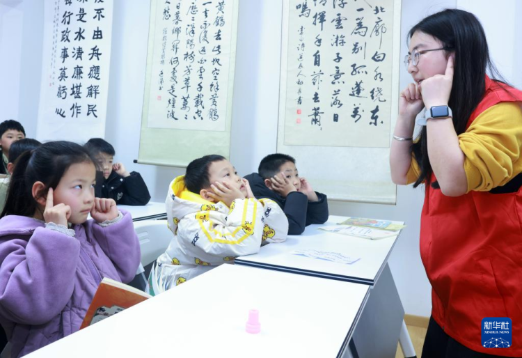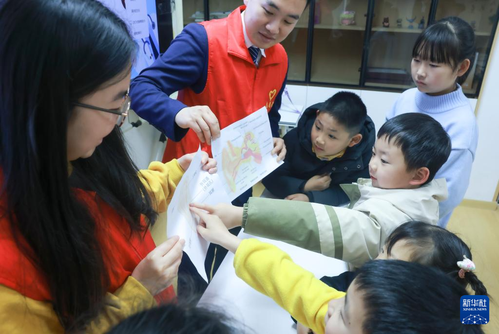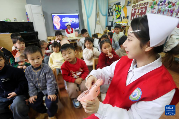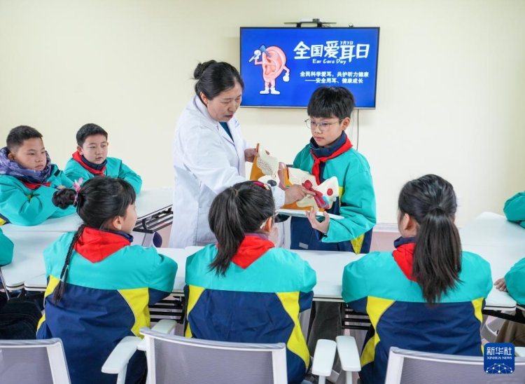 开云官方体育app在武汉市武昌区黄鹤楼街说想书社区,志愿者为小一又友莳植耳朵构造及科学护耳学问。 3月3日天下爱耳日降临之际,各地开展神态各样的主题活动,宣传爱耳护耳知识,温雅听力健康。 新华社发(赵军摄)" />
