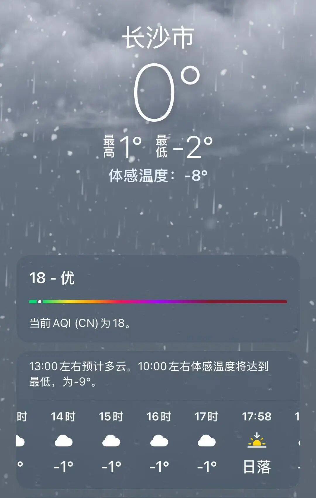 长沙市气象台预计,今明两日全市最低气温降至冰点以下,体感温度-8℃,城区有纯雪出现,山区有中到大雪。