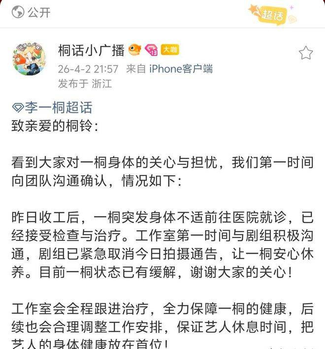 此次凌晨送医,骨子上即是始终透支的体魄积聚爆发。音信一出,全网齐在眷注她的现象。4月2日晚,李一桐责任室通过官方粉丝账号发出阐发:她是拍戏收工后突发不适才去病院,查验和治疗已完成,现在状态已缓解。剧组立即取消了她接下来的所有拍摄,让她宽解休养,责任室也容许将合理调度责任安排,把她的健康放在首位。网友们的格调确切一致,莫得东说念主说她矫强,齐备为她抓一把汗。