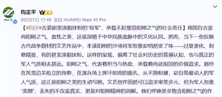 明确指出“死不悛改的古装将军,偏离众人对历史勇士的平常解析,承载不起塑造阳刚之气的社会牵涉”。