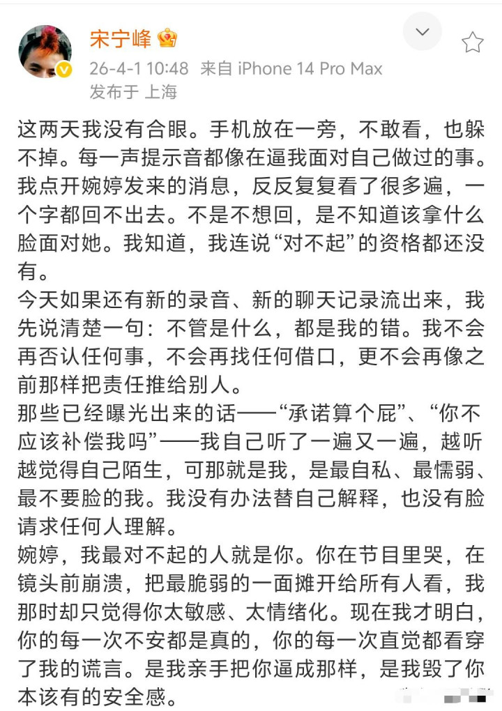 3月31号晚上,有狗仔陡然爆出猛料,放出了一段长达7分48秒的通话灌音,还有20多页的聊天记载,胜利把宋宁峰的婚外情锤死。