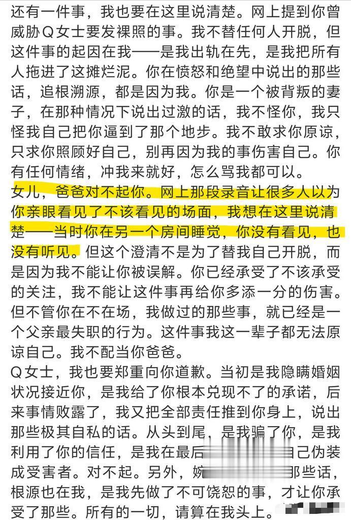 于是第一时辰相干Q女士,思让她串供,谎称两东谈主仅仅普通一又友,还倒打一耙,责问Q女士明知谈他有家庭,还防碍他的家庭,致使衣冠禽兽地问Q女士“是不是该抵偿我”。