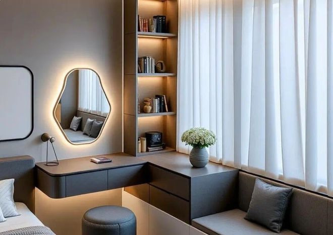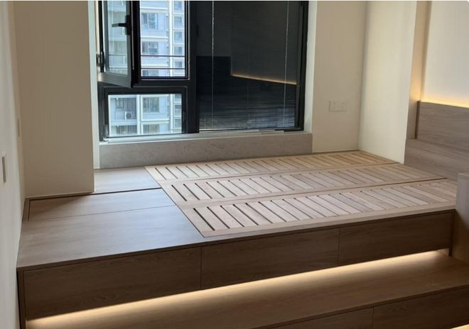 作念法提议:榻榻米的高度要与飘窗台面保握一致,过错要规则在一厘米以内,不然衔尾处会有台阶感,卓著不舒心。