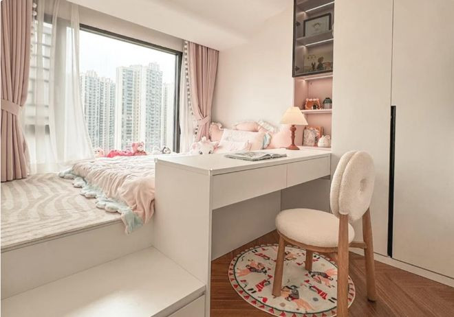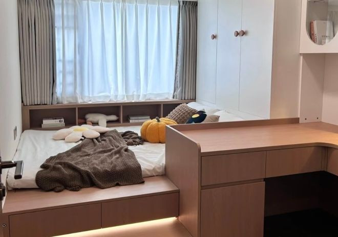 飘窗改延长式榻榻米的装修操办决议,卓著妥当次卧或者儿童房。底本放下一张床以后,悉数卧室的空间就相比紧凑,所剩无几了。目下把床和飘窗连成了一体,床的宽度齐顿然扩大了。