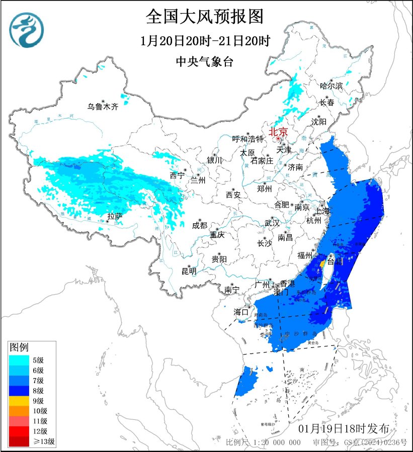 预计,1月19日20时至20日20时,西藏中西部、青海南部、内蒙古中部、河北北部、江淮东部等地部分地区有5~6级大风、阵风7~8级;黄海大部海域、东海大部海域、台湾海峡、台湾以东洋面、巴士海峡、南海东北部海域将有7~8级、阵风9级的大风,其中台湾海峡部分海域风力可达9级、阵风10级。