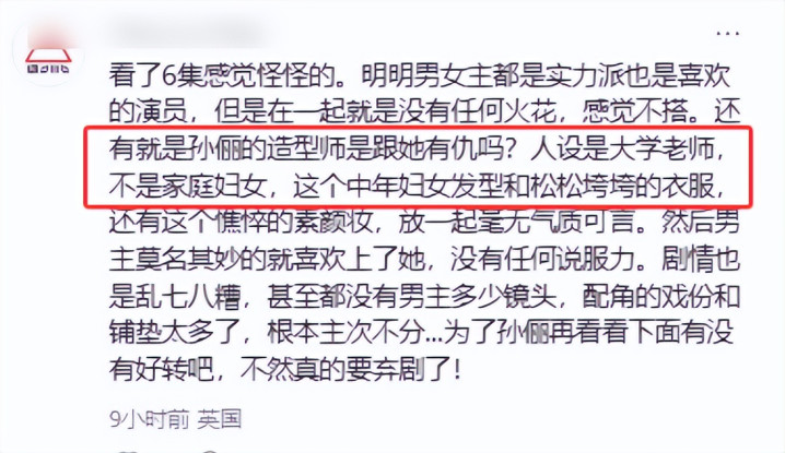 难怪网友看了之后都在吐槽,“造型师是跟孙俪有仇吗?把大学本分演成了家庭妇女”、“演技在线,但造型拉胯,看长远确凿出戏”。