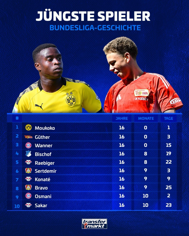 开云官方体育app 德甲史上最年青首秀榜: 穆科科居首;居特尔超万纳排第二