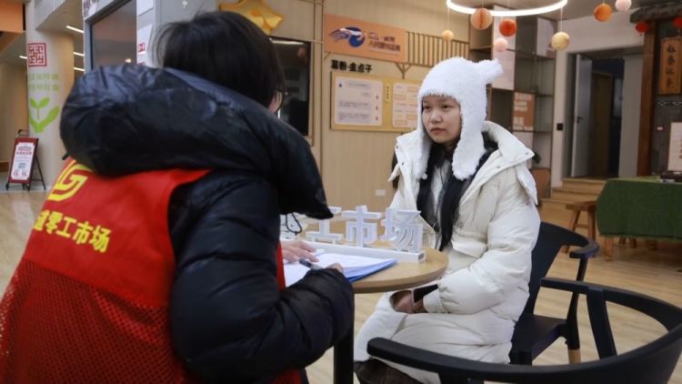 在杭州市余杭区仓前街道零工市场,负责人曹玉华正在对过往求职者进行就业回访。24岁的唐玉婷此前通过零工市场,从事过手工串珠师、售票员、服务员等多个零工岗位,也参加过各类技能培训。
